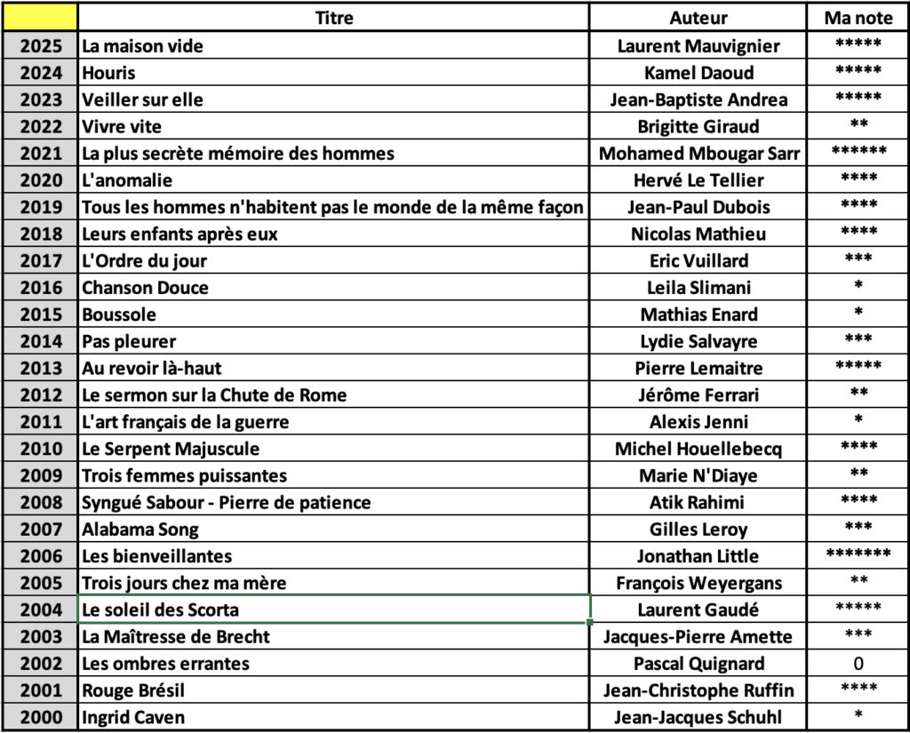 Me voilà à jour sur tous les Prix Goncourt depuis 2000. En voici le résumé. Bien évidemment, tout cela est forcément subjectif et ne reflète que mon avis.